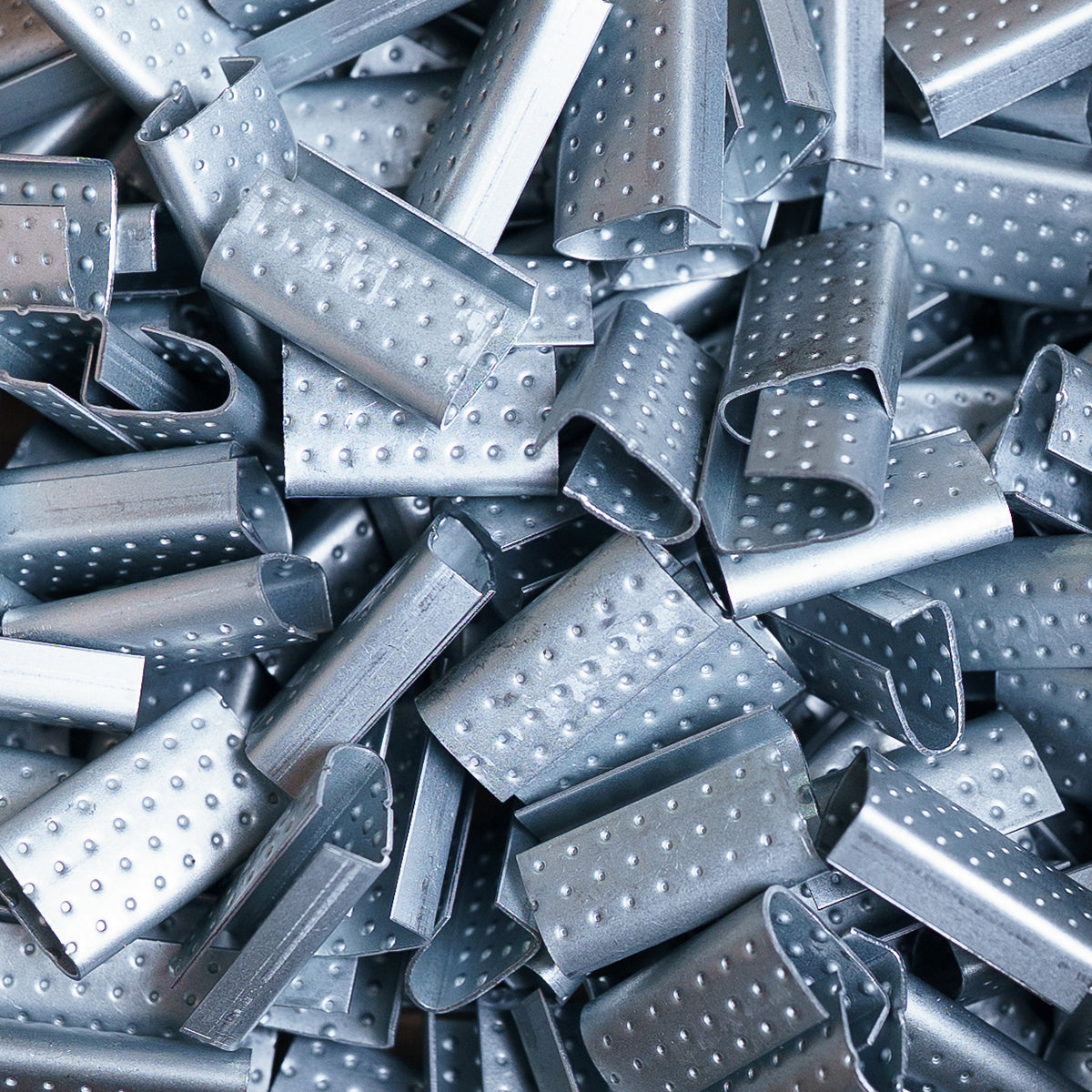 Los sellos metálicos dentados de 5/8" (0,8 mm) están diseñados para brindar un cierre firme, seguro y duradero en aplicaciones con zuncho PET. Gracias a su espesor reforzado y sus hendiduras internas (“dientes”), ofrecen una mayor adherencia y resistencia a la tracción, garantizando un enzunchado confiable incluso en cargas de alta exigencia.